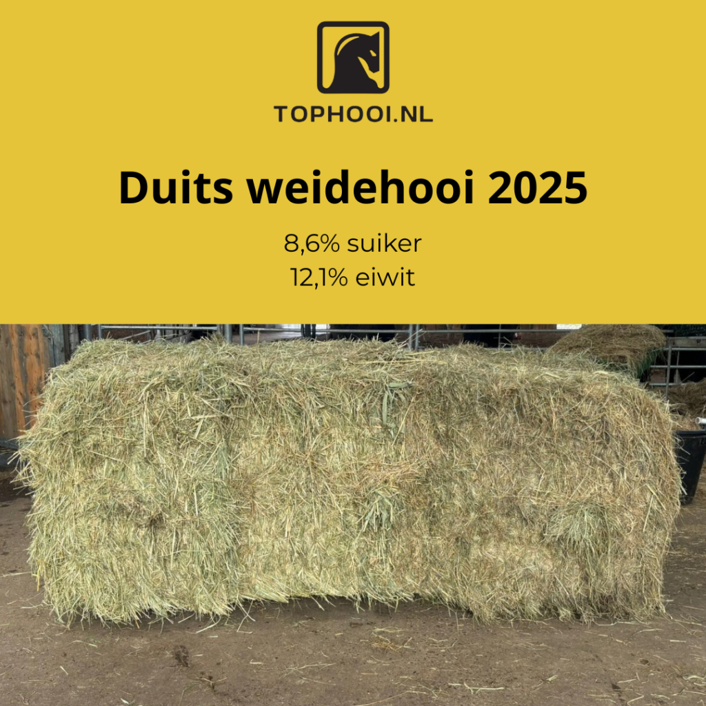 Op zoek naar hooi dat je het gehele jaar door kan voeren? Ons Duitse weidehooi is zeer geschikt voor onbeperkt voeren gedurende het gehele jaar. Door het lage suikerpercentage is het veilig om te voeren en zullen paarden er niet te snel te dik van worden. Wel is het hoger in eiwit en daardoor ideaal voor paarden die iets sneller spier verliezen of voor bijvoorbeeld sportpaarden en drachtige merries.